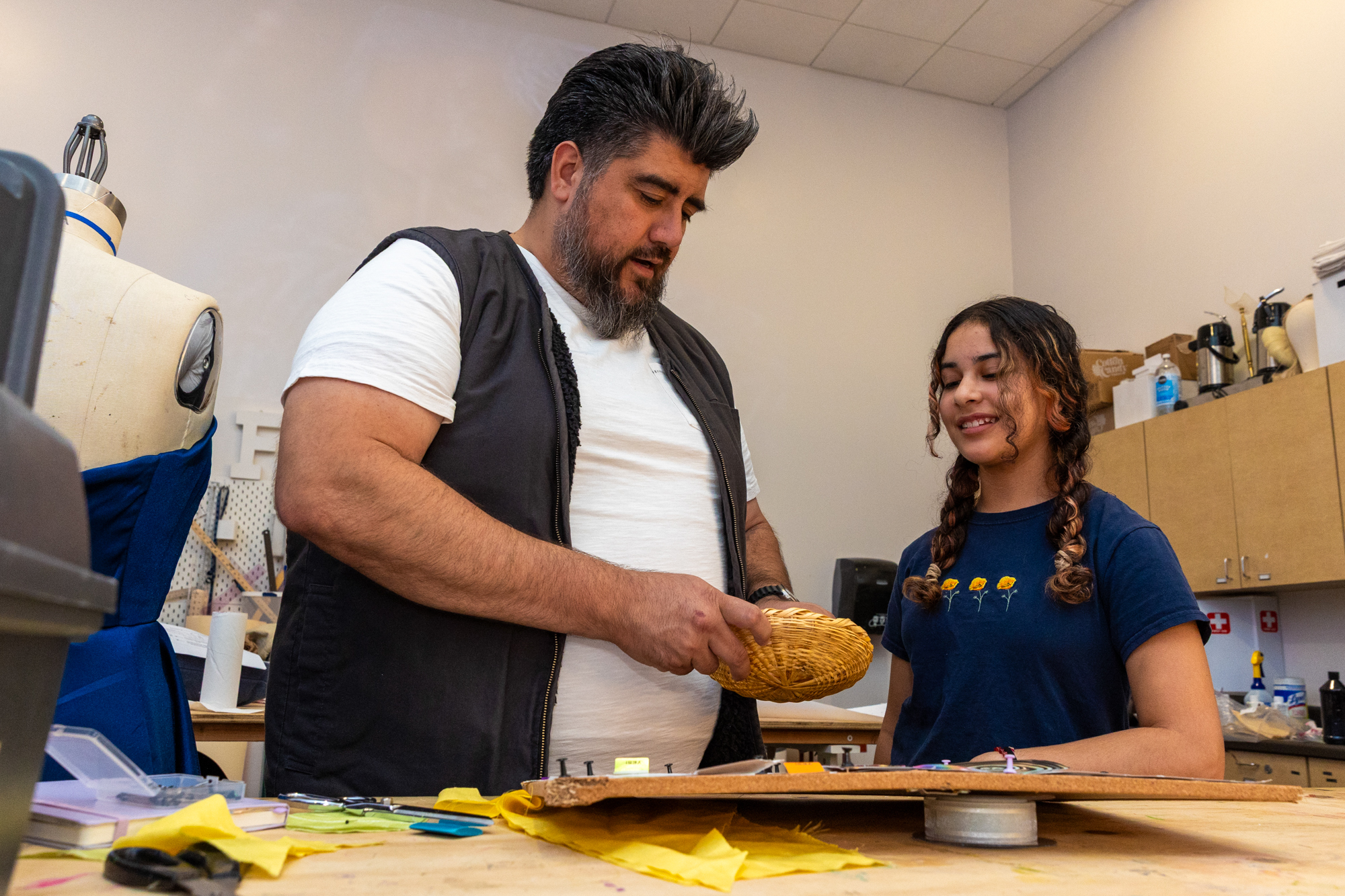 Kylie Didrickson, a ninth grader and fourth-year OSA fashion design student, partnered with Crystal Wahpepah after learning that the chef’s Fruitvale business, Wahpepah’s Kitchen, was the first Indigenous restaurant to open in Oakland. Didrickson is part Indigenous herself — her father, who is Alaskan Native, went to the same after-school program at Oakland’s Intertribal Friendship House that Wahpepah attended while growing up.