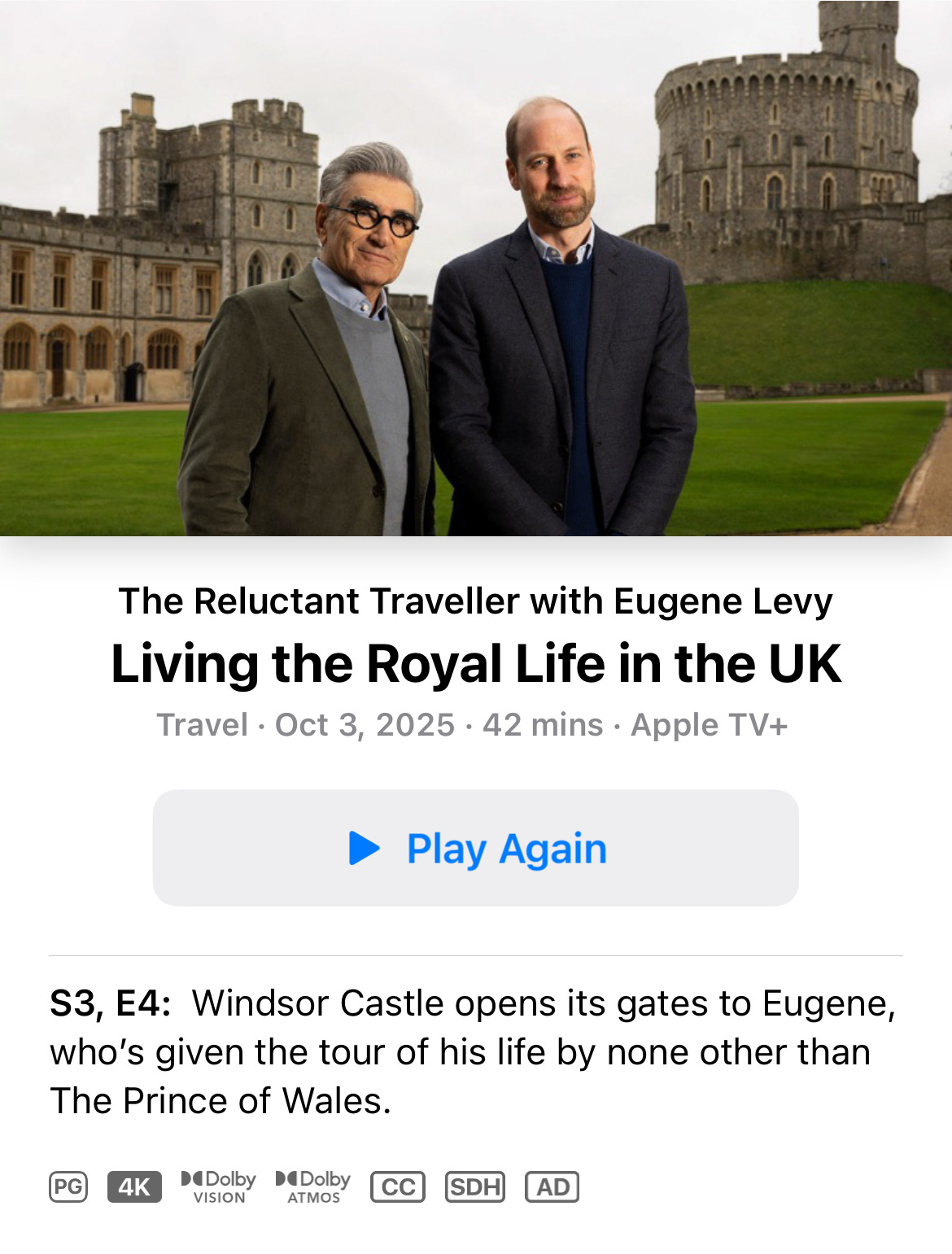 As I watched Eugene Levy chat with Prince William in Windsor Castle, on a dog walk, in a pub while enjoying a pint, I was struck not only by the content but also by the impact of having his first major interview since his wife and father were diagnosed with cancer be with a 78-year-old Canadian comedian on a travel show. The Reluctant Traveler may be an award-winning series in its third season on Apple TV+ but it’s hardly the show one would expect to feature such must-see royal watching.