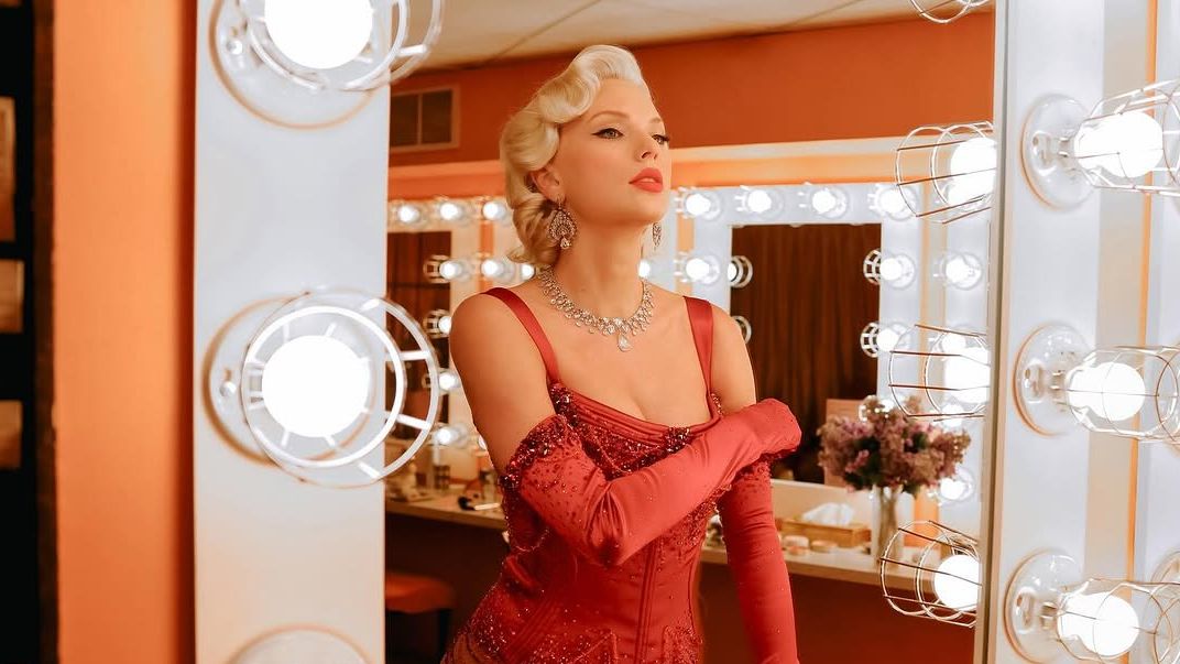 In the next scene, we see a clapperboard with the title Sequins are Forever – a play on “Diamonds Are Forever” or Marilyn’s “Diamonds Are a Girl’s Best Friend” – plus, “featuring Kitty Finlay”. Kitty is the name of the character at the centre of the song “The Life of a Showgirl”, and Taylor’s dearly departed grandmother, Marjorie Finlay, about whom she wrote the song “Marjorie”, was an opera singer, another kind of showgirl, if you will. The board also says “Take 100” – a reference to the line “keep it 100” in “The Fate of Ophelia”, as well as the fact that Taylor’s lucky number, 13, and Travis’s jersey number, 87, adds up to 100. As Taylor said on New Heights, “That’s numerology”.